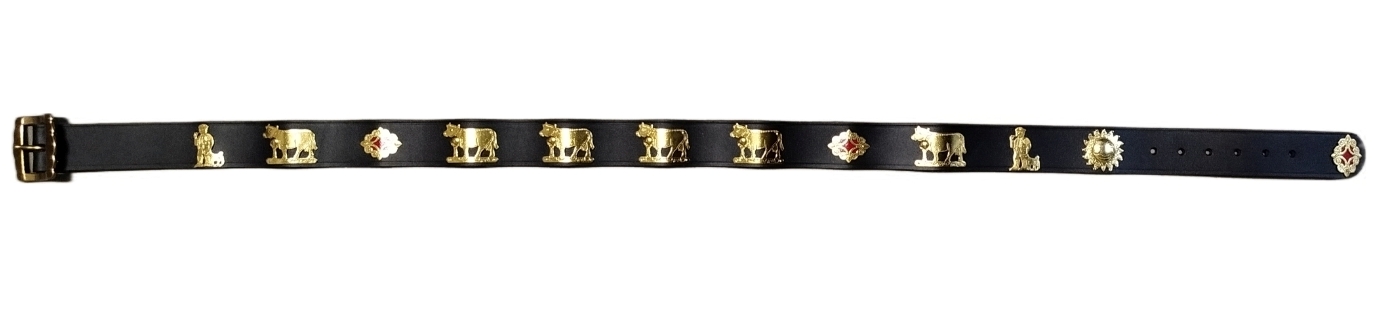Cintura con mucche e stelle - in Cuoio 35-40mm sp.3-4mm - decorata con Personaggi Desmontegada e stelle alpine cm.125