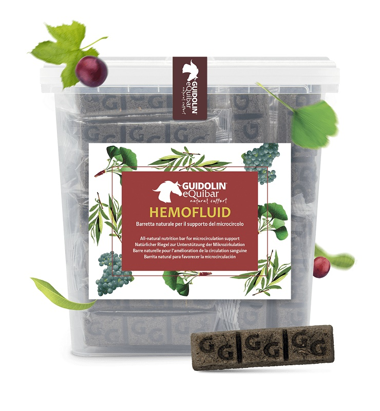 Equibar Hemofluid, mangime complementare per cavalli a forma di barretta, da somministrare da solo o insieme al pasto, formulato con erbe officinali dalle efficaci proprietà antinfiammatorie, antiossidanti, fluidificanti del sangue e drenanti, che agiscono sul funzionamento della microcircolazione con una naturale azione rinvigorente, tonificante ed antinfiammatoria.