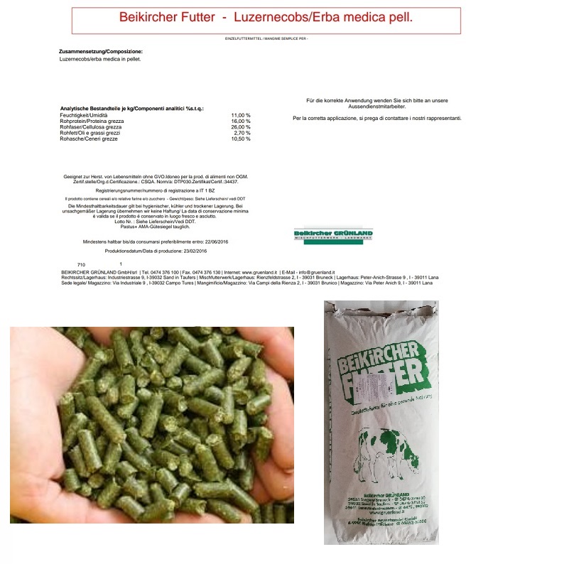 Erba medica trinciata, disidratata e pellettata con procedimenti meccanici che conservano inalterate le naturali ed originali caratteristiche nutritive della pianta: proteine, fibre, minerali biodisponibili, lipidi, vitamine, provitamine, grassi polinsaturi (omega-3 e omega-6), oltre a zuccheri, carotene e lignina che, dato l'elevato potere antiossidante, garantisce la salute del microbiola ruminale ed intestinale.