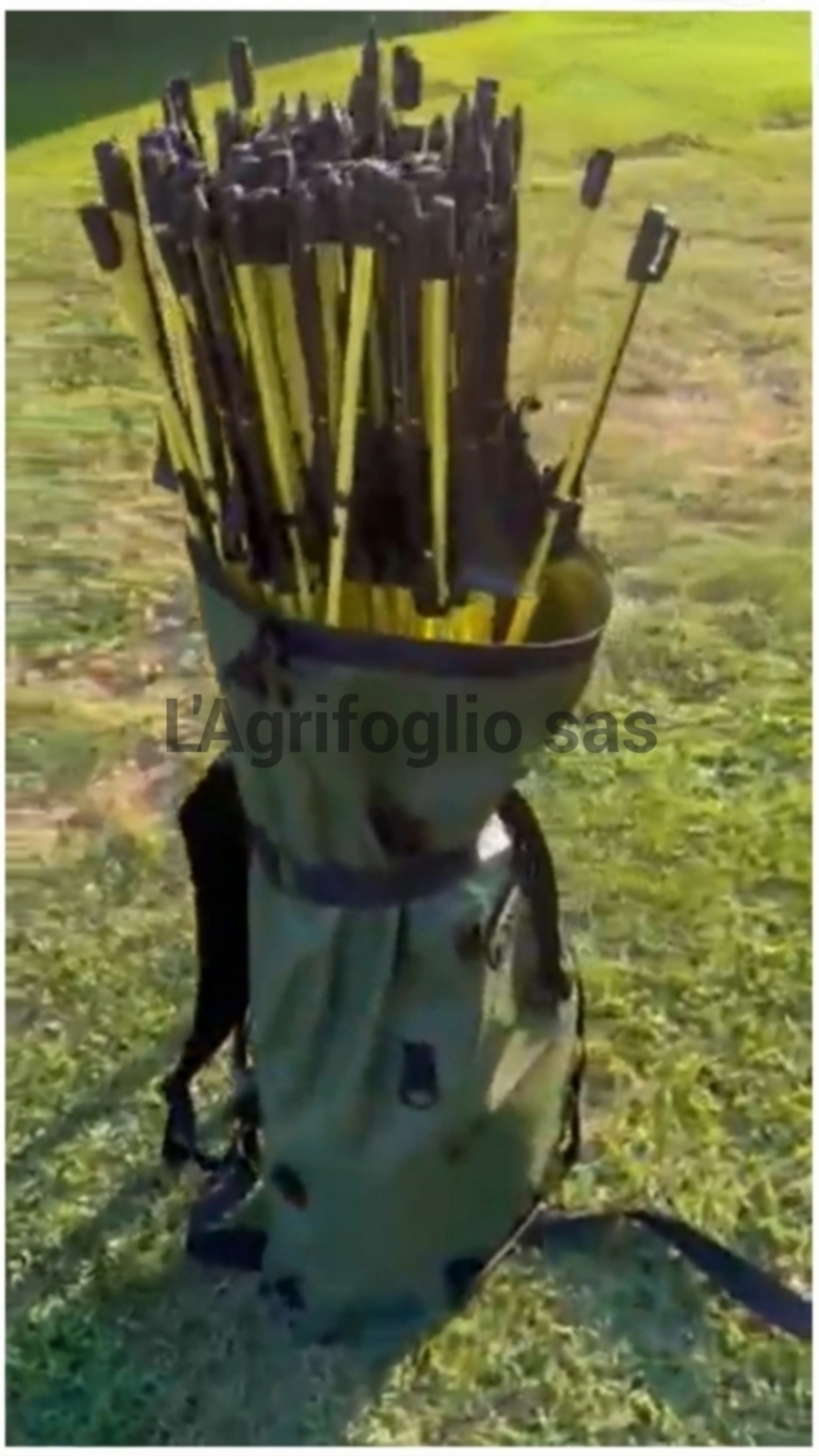 Progettata per offrire massima praticità e resistenza, la sacca è realizzata interamente in PVC telato. È dotata di doppio fondo con la possibilità di inserire un rinforzo rigido, moschettoni in metallo e anelli per appendere bobine di filo. Include inoltre una tasca esterna con chiusura a cerniera, ideale per riporre isolatori e piccoli attrezzi. Le spalliere imbottite e la cintura di sostegno in vita garantiscono comfort anche durante un uso prolungato. Una seconda cintura consente di portare la sacca a tracolla, facilitando l'inserimento e l'estrazione dei paletti anche in movimento. Capacità: fino a 150 paletti in vetroresina con punta in plastica, oppure 45-50 paletti in plastica.